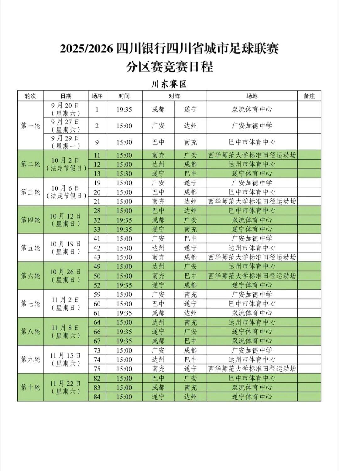 记者9月11日从四川省足球协会获悉,“川超”开赛在即,分区赛阶段4大赛区的竞赛日程正式出炉。