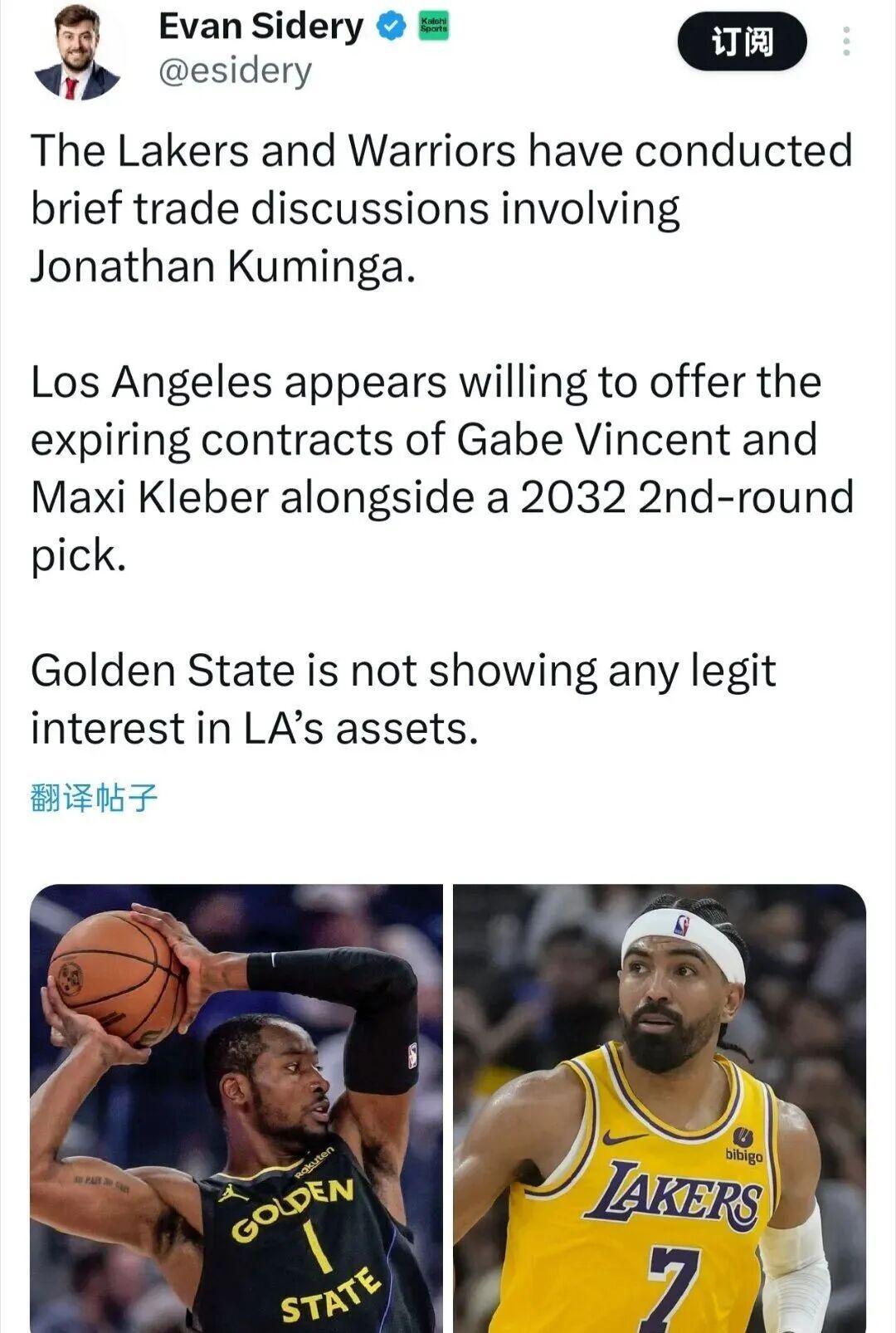 只不过根据美记Sidery爆料,湖人只愿意提供文森特+克莱伯两位均处于合同年的球员,以及一个32年次轮签,对于这样的筹码勇士显然嗤之以鼻,宁愿库明加彻底砸在自己手里的那种。