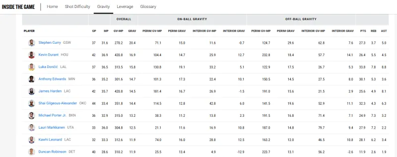 虎扑01月27日讯 此前,NBA官方推出新的数据统计指标——Gravity(引力值)。
